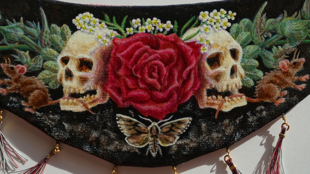 October 2019. Large painted bib with adjustable chain necklace, length approx. 19-27″. Bib dimensions 8 7/8″ x 4″. Acrylic on canvas, coated with UV resistant sealant spray, decorative suede fabric backing.