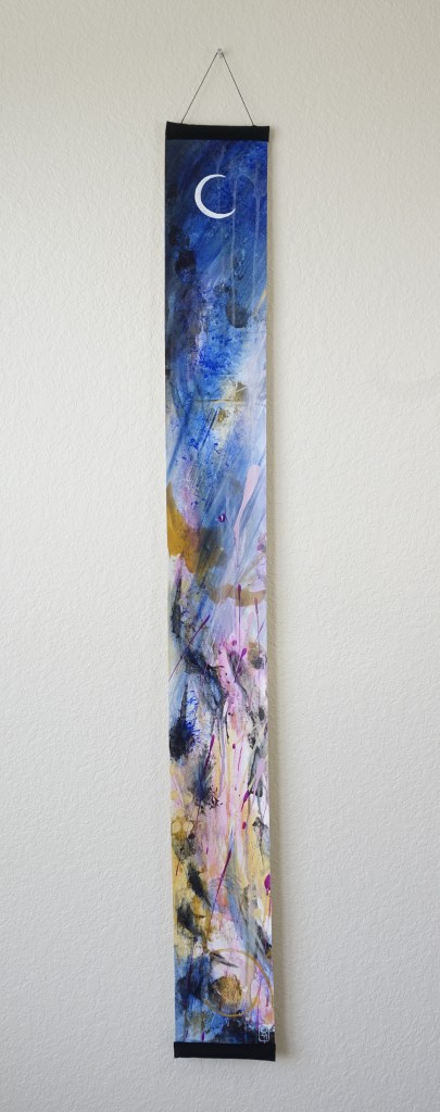 Acrylic on pre-gessoed canvas, hung in wall-scroll format. 53″ x 5.75″