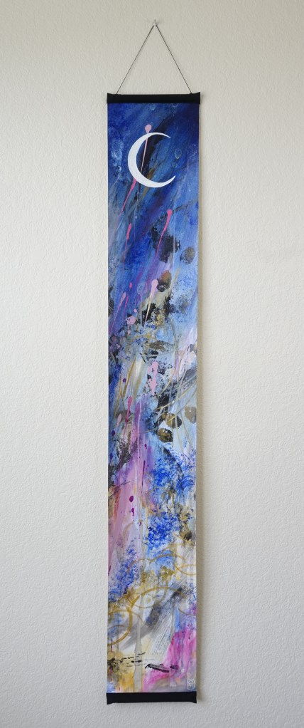 Acrylic on pre-gessoed canvas, hung in wall-scroll format. 52.5″ x 8″