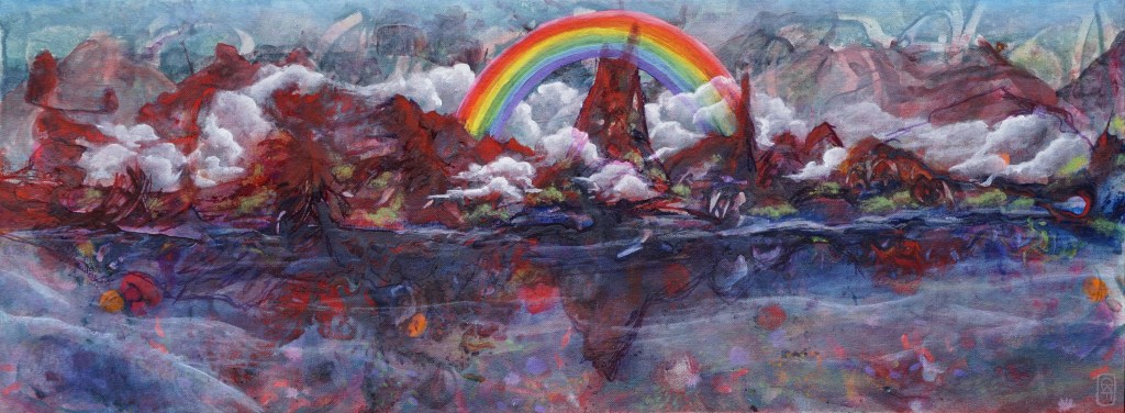 Started as an abstract painting, just feeling it out – eventually, a landscape showed itself and I pulled it forward. ‘Neverland’ was the result. A beautiful place to have an adventure and explore.